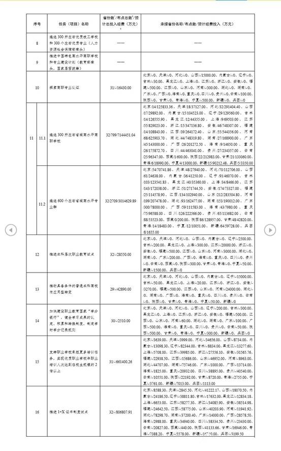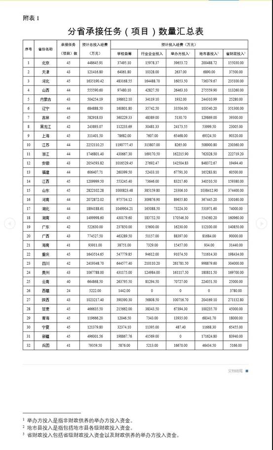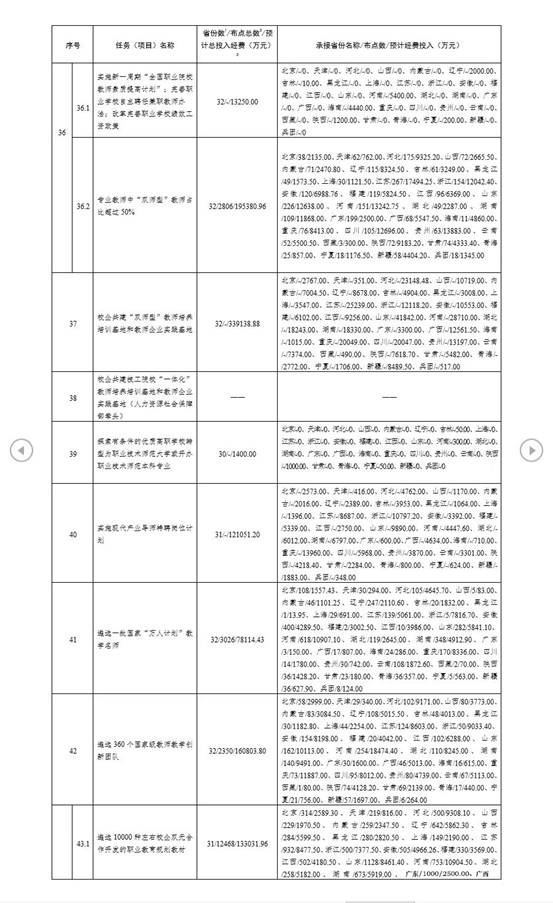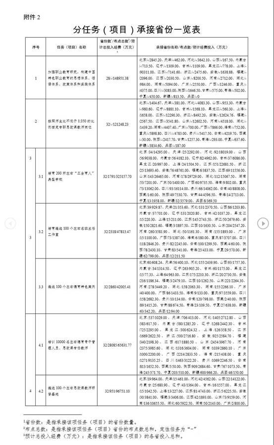 根据《关于承接〈职业教育提质培优行动计划(2020—2023年)〉任务(项目)的通知》(教职成司函〔2020〕32号)要求,各省级教育行政部门积极组织申报,确定了本地拟承接的任务(项目)数量、承接单位和支持经费。现将各地承接情况予以公布,详见附件1、附件2。建设期内,各地承接的任务(项目)原则上不作调整,确需调整的须由省级教育行政部门函报我司备案。